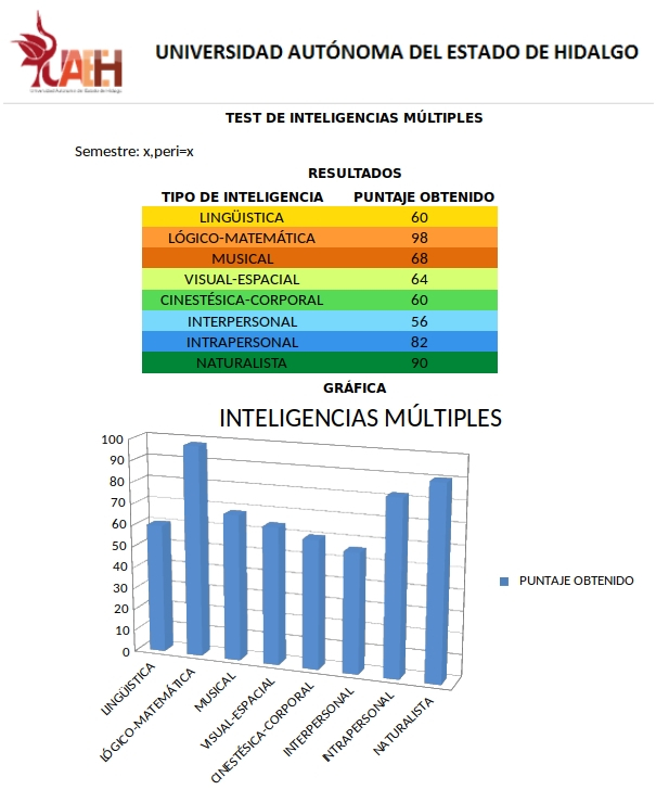 Mis test resulto con las características que esperaba de acuerdo a mi desarrollo y las habilidades que he adquirido. Siendo desde niña mi interés la ciencia la inteligencia que más he desarrollado es la lógica-matemática, la naturista como forma de vida, también los resultado de mi inteligencia intrarpersonal, son correctos ya que constantemente hago ejercicios de auto-descubrimiento e introspección, finalmente la musical siendo algo que disfruto pero no he desarrollado a lo largo de mi vida.